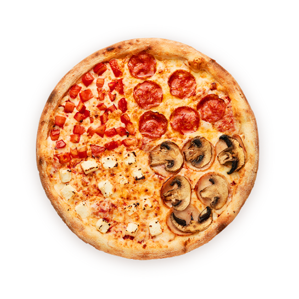 Peeled tomato, cheese, mushrooms, red onion, cherry tomato, black olives, rocket